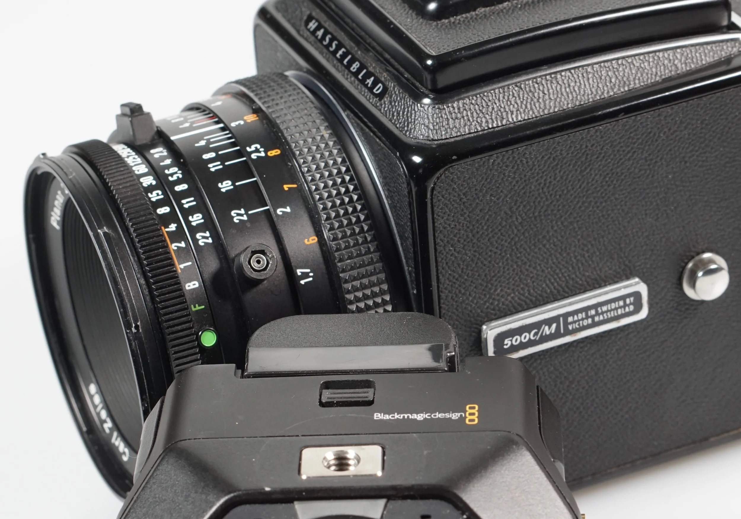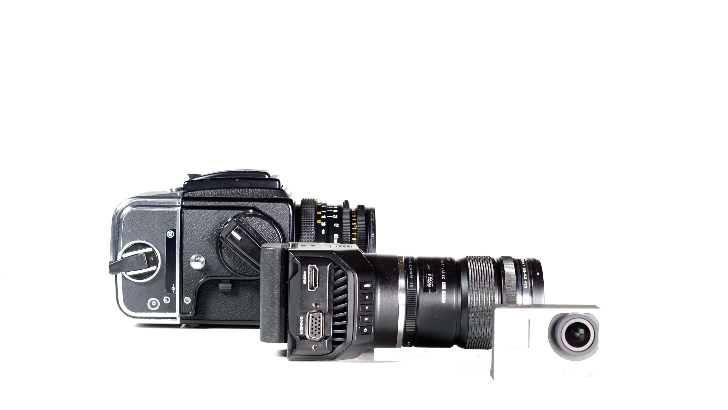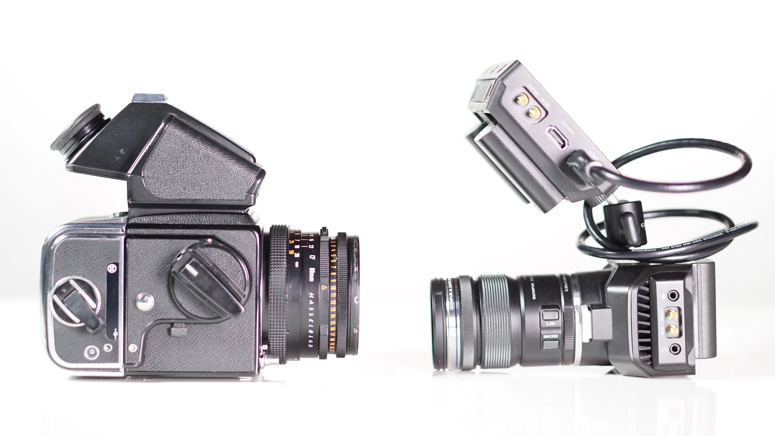 Hasselblad 500C/M with A12 back, Zeiss 80mm f/2.8 Planar and angled prism finder; Blackmagic Design Micro Studio Camera 4K with Video Assist and Olympus M.Zuiko ED 12-50mm f/3.5-6.3 PZ